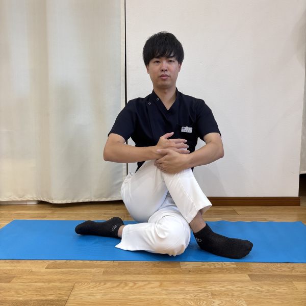 写真のように足を組んで、右膝と左肩を近づけるように引き寄せてください。